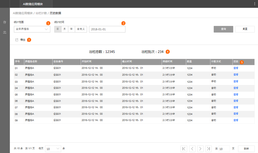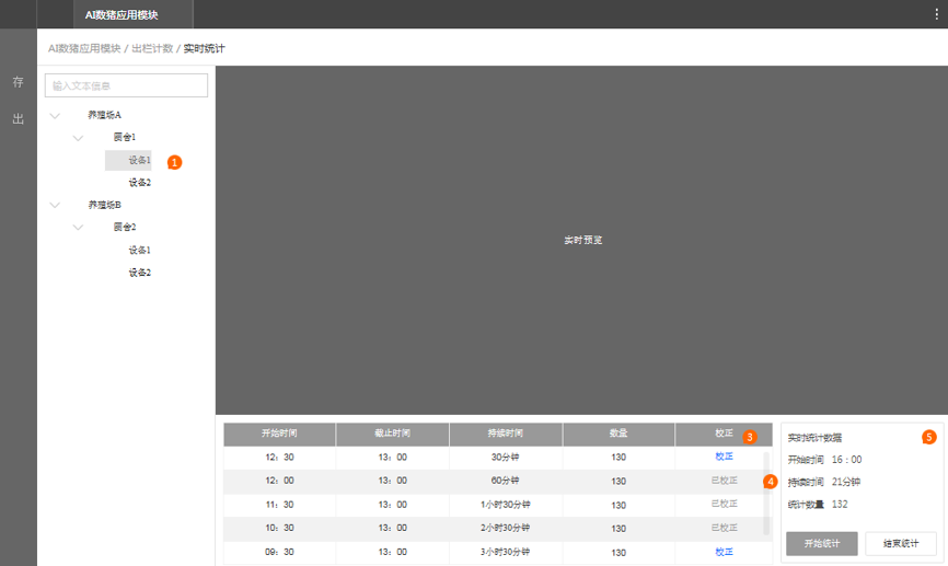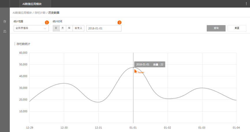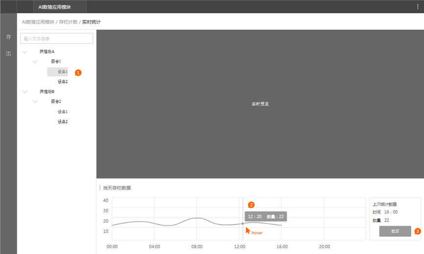 解决方案 为满足大型养殖场生猪存栏/出栏量的智能化统计需求,我们开发了基于AI平台的AI数猪智能检测算法,并搭配合适的智能分析硬件产品,形成AI数猪解决方案。通过AI计数对养殖圈舍内、通道处生猪群体/个体的视频或图片进行智能分析,自动给出统计结果,可大大减轻管理者的工作量,降低对生猪个体的影响,同时防止农户人为舞弊谎报猪只数量私自贩卖猪只,减少企业经济损失,提高猪场管理的信息化水平。 为解决这一问题,我们基于AI平台开发了AI数猪智能检测算法,并搭配合适的智能分析产品,开发出AI数猪智能资产盘点系统。  AI数猪智能资产盘点方案包括两部分:①存栏量盘点,②出栏量计数。 ① 存栏量盘点:通过部署在圈栏上方的高清半球+超脑NVR的方案实现自动存栏计数,实现活体资产的远程快速盘点,为市场决策管理提供依据; ② 出栏量计数:通过出猪通道上方的智能垂直单目摄像机实现自动出栏计数,减少人力投入和管理成本,快速掌握全天卖猪数据,便于财务核算。 存栏量预览及统计模块 模块功能: 1、平台要支持生猪存栏数量实时统计和展示当天统计数量的曲线图; 2、支持手动输入数值对统计数量进行校正; 3、平台支持历史存栏统计,可以按照养殖场名称、圈舍编号、设备编号和统计粒度进行统计,并曲线展示。  图1. 圈舍存栏量预览 为保证统计误差的一致性,每隔一段时间(如1分钟)取一次值,每10分钟为一个统计节点,每个节点显示该统计时段内的校正值;当前统计数量为达到最近一个统计时间点后显示的统计数量。点击校正后输入一个人工计数的数值,确定后即可手动修改统计数字,同时将对应的截图和修改后的数值保存在校正图像集中(存平台),用以后续的算法优化。该页面只显示当天的存栏数曲线,若要查看历史数据可以点击更多查看存栏量历史统计。 图2. 存栏量历史统计 随查询规则改变:按年查询显示月份;按月查询显示日期;按日查询显示时分;但最小单位都是10分钟,压缩显示。出栏量预览及统计模块 模块功能: 1、支持对统计数量进行手动校正; 2、支持列表展示通道出栏的统计结果,列表内容包括:养殖场名称、设备编号、开始时间、截止时间、持续时长、数量、计数方式; 3、支持出栏历史统计数据的查询,查询条件包括养殖场名称、设备编号和查询粒度。查询结果内容包括:养殖场名称、设备编号、开始时间、截止时间、持续时长、数量、计数方式、数量、查看回放; 4、支持回放选择的出栏通道录像。  图3. 出栏通道过猪预览 点击校正可以手动调整统计数字并将对应的截图保存在校正图像集中,用以再次标定。 默认过猪数量是从检测到有猪经过时开始统计,到画面里面没有猪的时候结束,并给出对应的持续时长。  图4. 出栏量历史统计 自动出栏统计:从有猪经过画面开始清零并自动计数,至1分钟内没有猪经过时结束该次统计,自动给出本次过猪数据。 点击校正后输入一个人工计数的数值,确定后即可手动修改统计数字,同时将对应的视频录像和修改后的数值保存在校正视频集中(存平台或超脑),用以后续的算法优化。